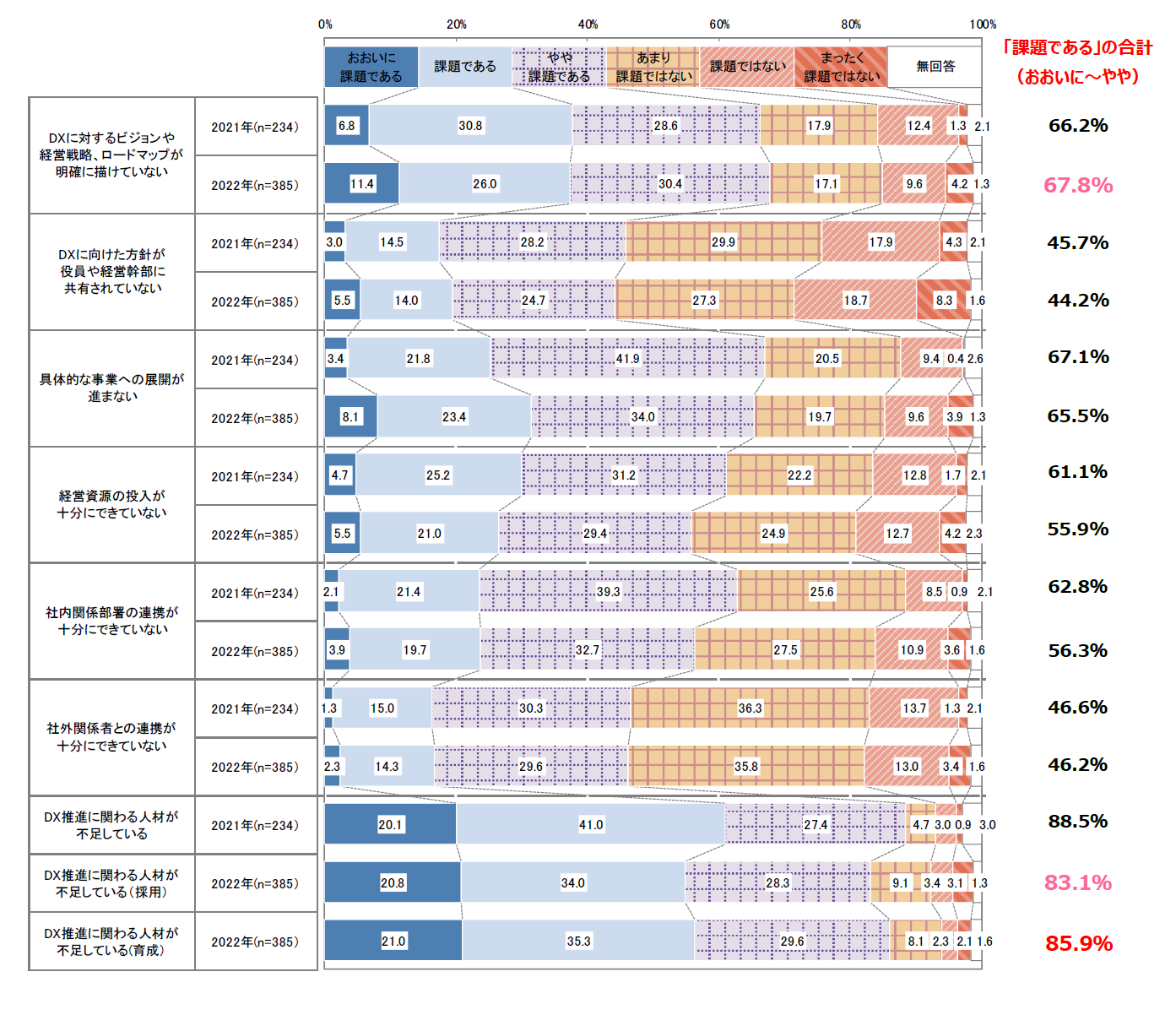 ○ DXに「既に取り組みを始めている」と回答した企業(n=385)に対して、DX推進の課題について尋ねたところ、「DX推進に関わる人材が不足している(育成が思うようにできていない)」が85.9%、「DX推進に関わる人材が不足している(採用が思うようにできていない)」が83.1%と、DXを推進する人材への課題感が高いことがわかります。これは昨年と同様の傾向であり、昨今の人材不足の状況の中で、採用・育成どちらにおいても引き続き多くの企業が人材への課題感を持っていることがうかがえます。