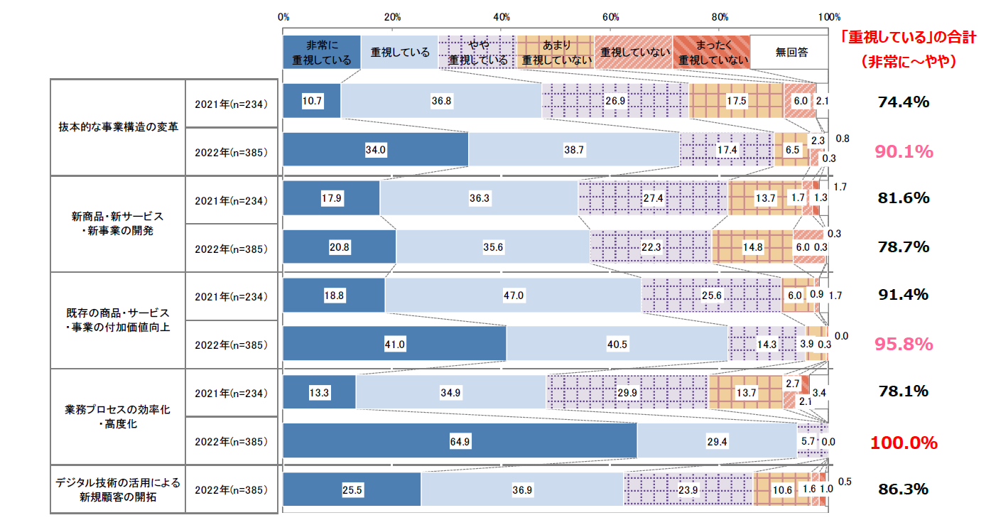 ○ また、「抜本的な事業構造の変革」は90.1%が重視と、昨年と比較して大幅に増加しました。DXの取り組みを時代の変化に対応する事業構造改革に活かしていくという、企業の積極的な姿勢がうかがえます。