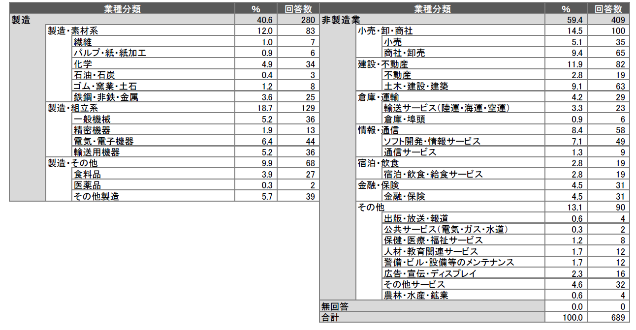 | 回答数・回収率 | 回答数689社・回答率13.8% (回答企業の概要は下部もしくは、詳細リリースの5ページに記載) |