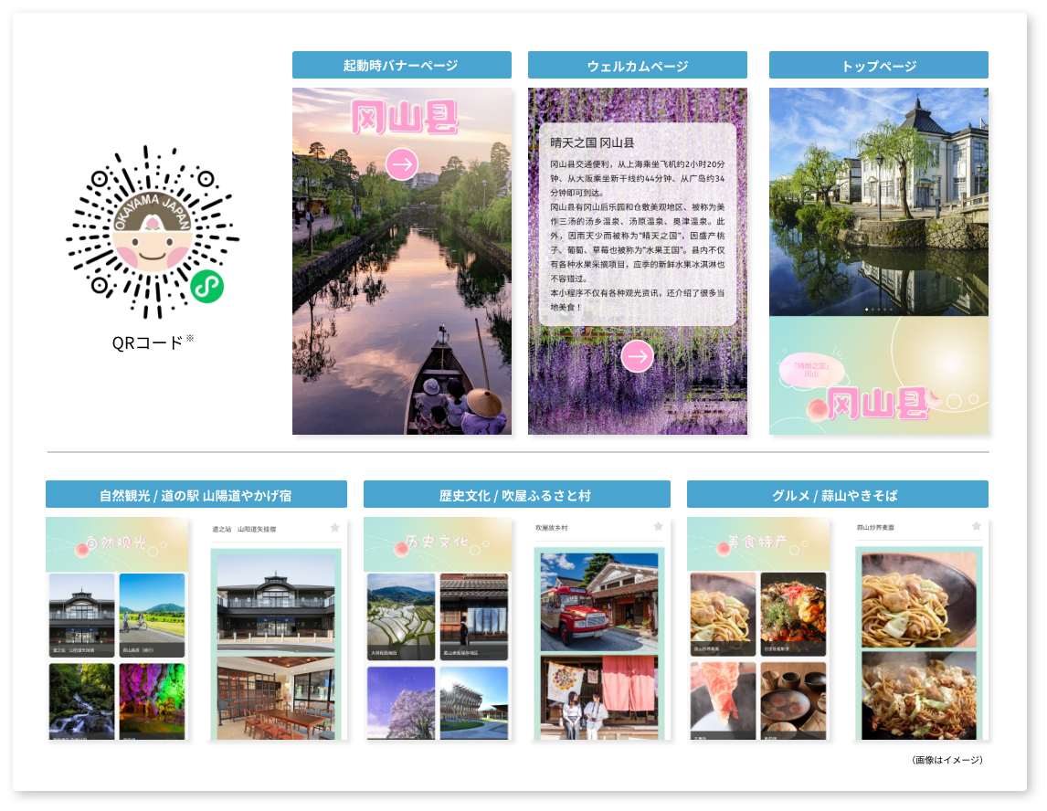 約13億人が日々の生活で利用している中国最大のSNS「WeChat(ウィーチャット)」内に、自然観光(道の駅山陽道やかげ宿・蒜山高原・神庭の滝自然公園など)や歴史文化(大垪和西の棚田・勝山街並み保存地区・吹屋ふるさと村など)、グルメ(ひるぜん焼きそば・日生カキオコ・千屋牛など)の様々な情報を、特産である桃をあしらった可愛らしいデザインとともに、岡山県の魅力をWeChat(ウィーチャット)ユーザーに対してより親しみやすく発信いたします。