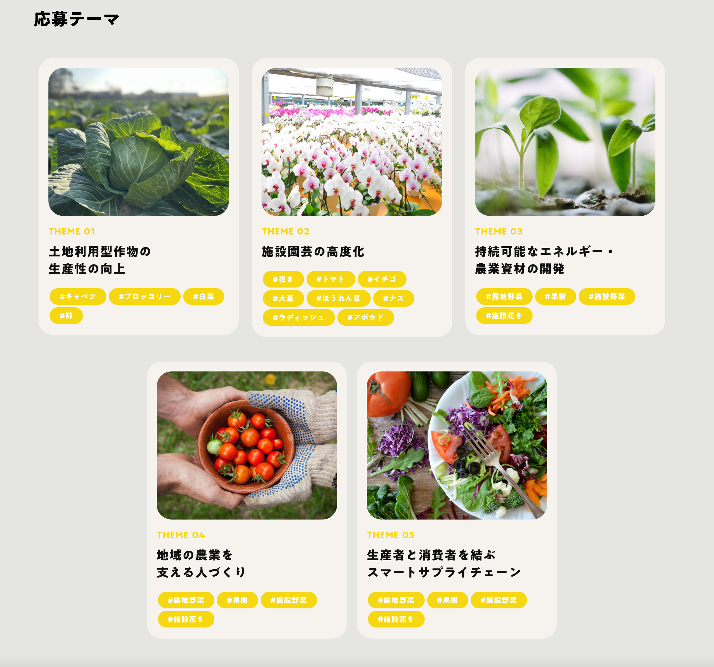 賞金(支援金)総額1,000万円の「アグリテックコンテスト」として、地元の農業者が抱える課題からテーマを設け、解決策の提案を全国のスタートアップから募集しています。
