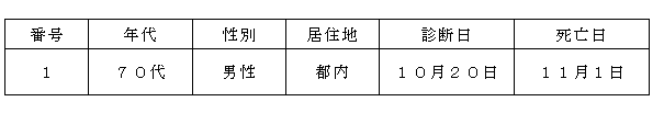 新型コロナウイルスに関連した患者の死亡について business Twitter Facebook はてブ Pocket LINE コピー 2022.11.05 この記事は約1分で読めます。 都内で新型コロナウイルスに感染した方が死亡されましたのでお知らせします。 お亡くなりになった方のご冥福をお祈り申し上げます。 ※ 患者・御家族の人権尊重・個人情報保護に御理解と御配慮をお願いします。
