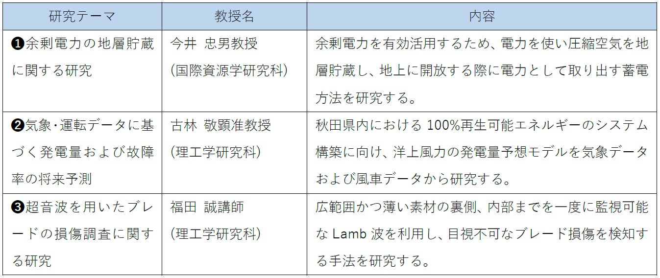 コスモエネルギーホールディングス株式会社(代表取締役社長:桐山 浩)のグループ会社であるコスモエコパワー株式会社(代表取締役社長:野地 雅禎、以下「コスモエコパワー」)は、株式会社ウェンティ・ジャパン(代表取締役社長:佐藤 裕之)、清水建設株式会社(代表取締役社長:井上 和幸)、石油資源開発株式会社(代表取締役社長:藤田 昌宏)の4社で出資する秋田中央海域洋上風力発電合同会社(代表職務執行者:塩川 要、以下「本合同会社」)において、風力発電産業の発展に向けた取り組みの一環として、秋田大学 国際資源学研究科及び理工学研究科との風力発電関連の技術開発に関する共同研究(以下「本共同研究」)契約を締結したことをお知らせいたします。