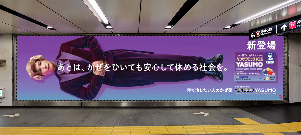 様々な要因でかぜをひいても休みづらい現代社会。「寝て治す」という今までにない新しいコンセプトのかぜ薬の登場をきっかけに、多くの人々が「休む」ということへの意識を変え、自分のためにも周囲のためにも体調が悪い時は「無理せず休む」という選択を難なくできるようになってほしいという想いが込められたメッセージになっています。多くの人がせわしなく行きかう渋谷、梅田、名古屋に掲出することで、羊の執事の岩田さんが「あとは、かぜをひいても安心して休める社会を。」と問いかけながら、休みたくても休めない忙しい現代人に「かぜをひいたらぐっすり休んでぐっすり治そう」と誘う姿が印象的な広告となりました。