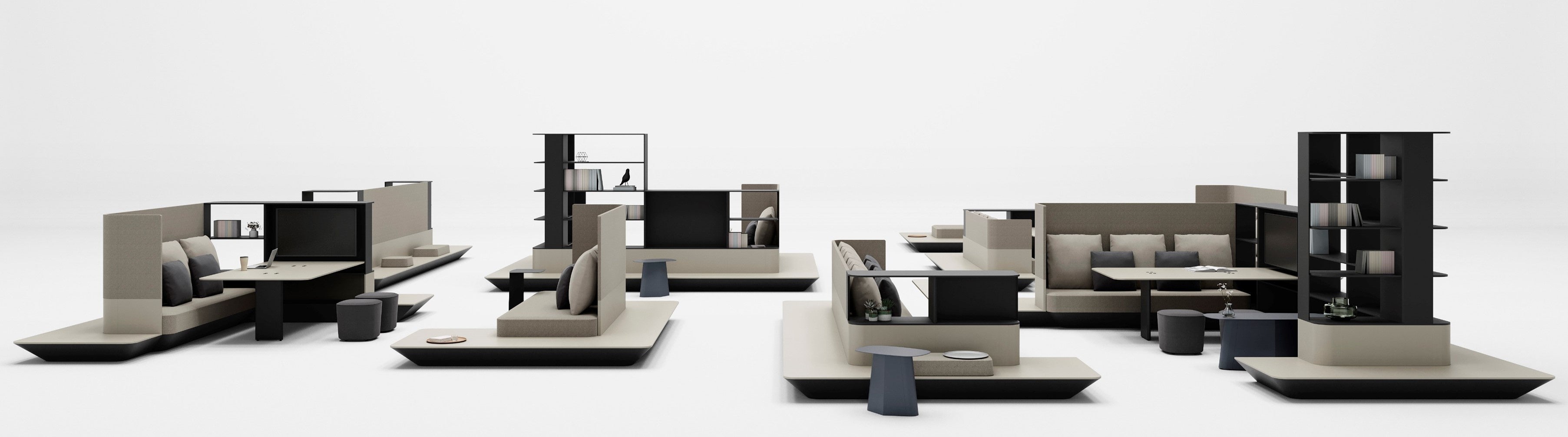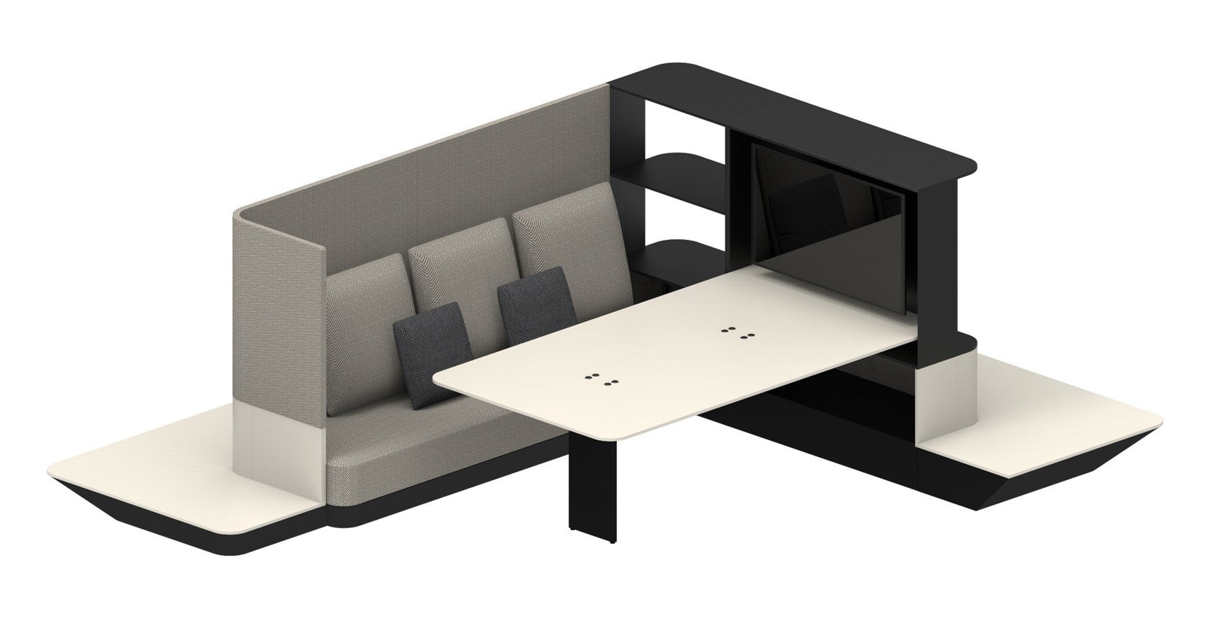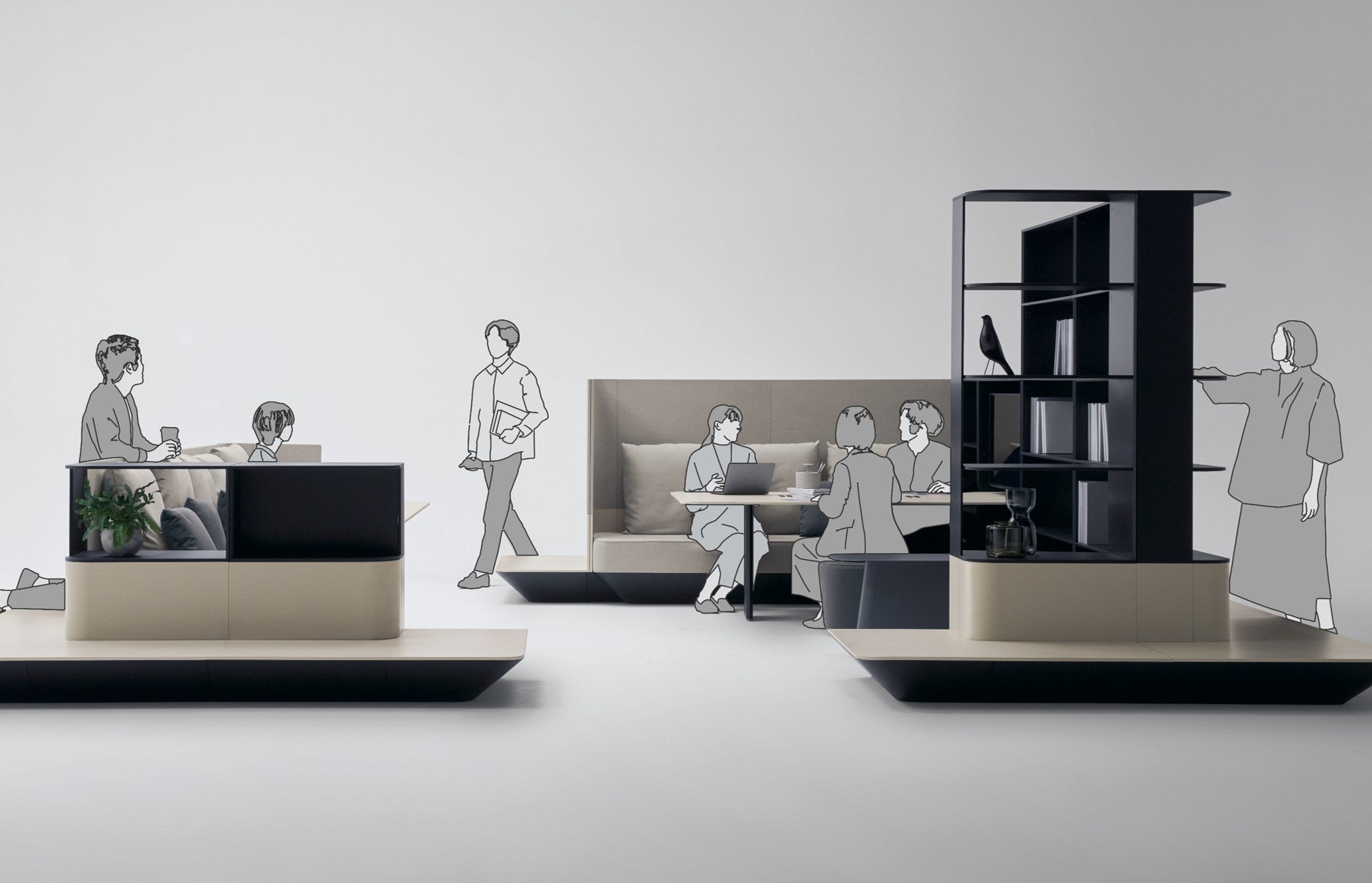 すぐに情報共有ができるチームの拠点となる場です。ソファ、ミーティングテーブル、シェルフを組み合わせて、チームでの打ち合わせや個人作業を行うことができます。出入りがしやすいオープンな設えで、チームのメンバーが気軽に立ち寄ることができます。メンバーそれぞれの拠り所となることで、チームの一体感を高めます。