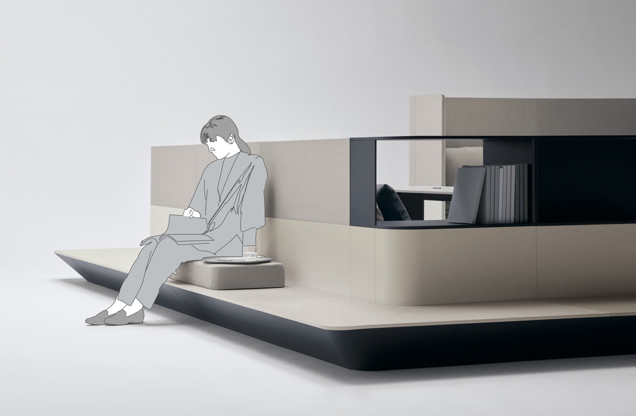 チームの内と外をつなぐ場です。縁側は、ソファ、ミーティングテーブル、シェルフを組み合わせたユニットの外に張り出しており、腰掛けることができます。周囲からもチームの様子がわかり、気軽に意見をもらったり談笑したり、人と場をつなぎます。ちょっとした作業スペースとしても機能します。