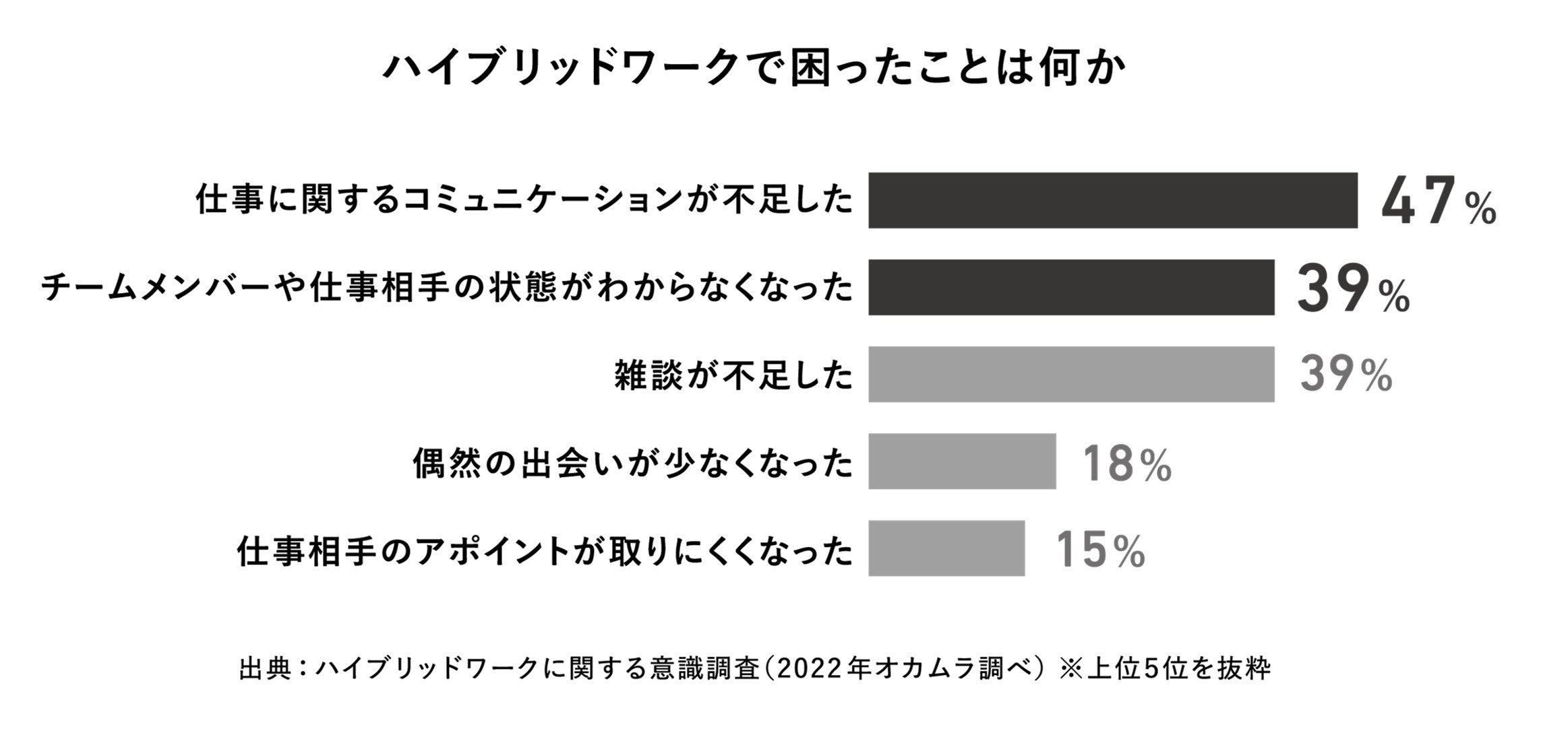 テレワークが普及し、オフィス出社とテレワークを組み合わせたハイブリッドワークが広がっています。ハイブリッドワークは、目的や必要に応じて働く場所を選択することで時間や場所にとらわれない柔軟な働き方である一方、一人ひとりの様子がわかりにくくなり、お互いのコミュニケーションが取りにくいという課題があります。オカムラの調査※によると、出社とテレワークを組み合わせたハイブリッドワークでは、仕事に関するコミュニケーション不足、チームメンバーや仕事相手の状態がわからないと感じているワーカーが多いという結果が出ています。また、7割がオフィスにチームメンバーが集まることができる場所が必要だと感じています。
