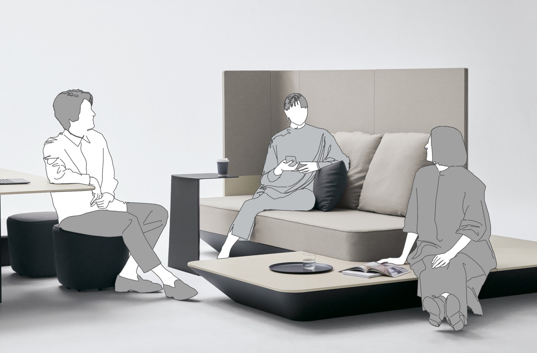 「ワークヴィラ」は、ソファやミーティングテーブル、シェルフなどで構成されたチームメンバーの溜まり場となるスペースと、溜まり場から外へつながる縁側を組み合わせたユニットです。ユニットを複数配置し、「溜まり場」「縁側」「小路」の組み合わせにより、さまざまなコミュニケーションを生み出すことが可能です。