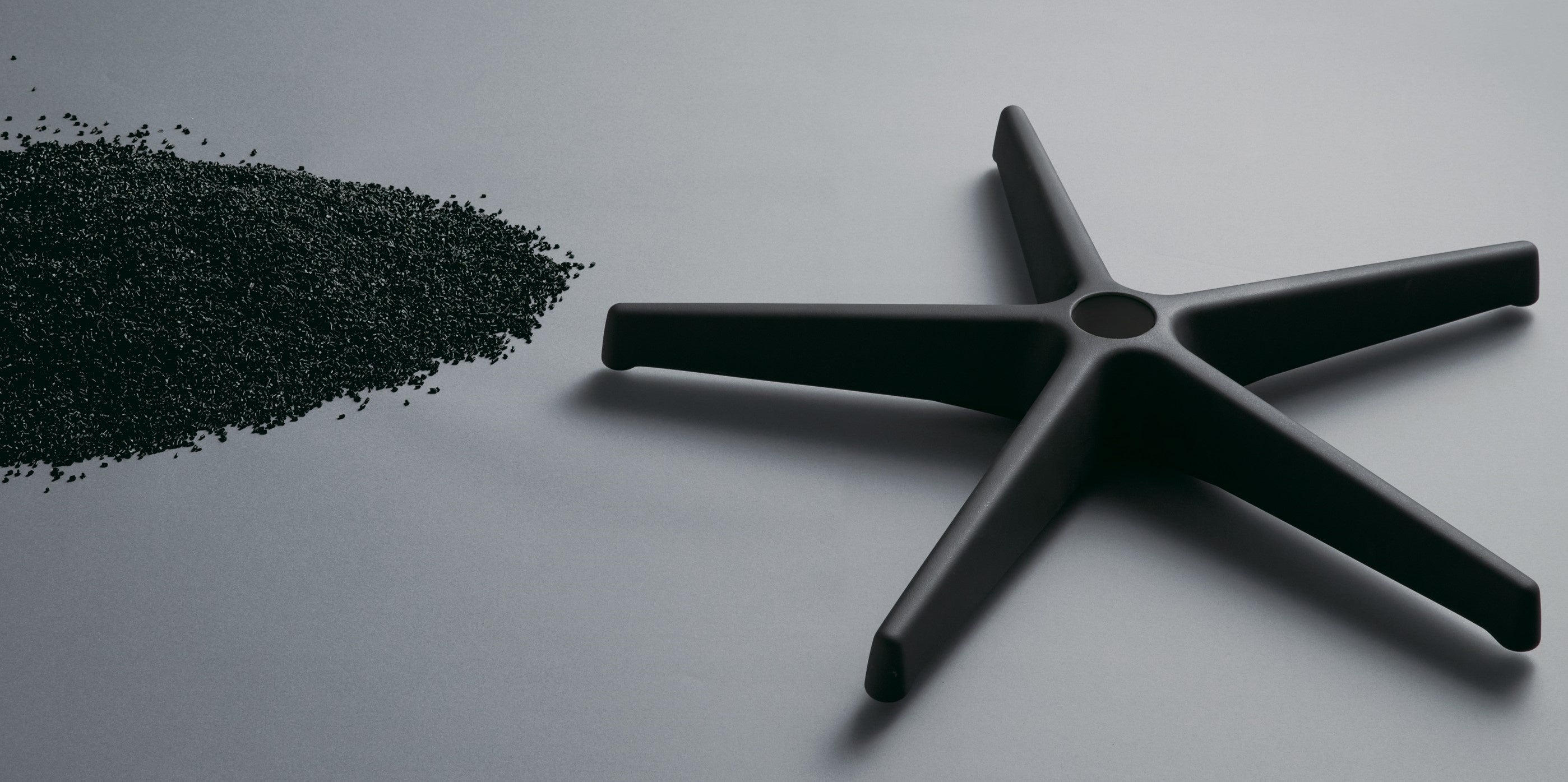 「リバース」プロジェクトにて、オフィスチェアとして使用済みの樹脂脚を回収し、分別・粉砕を経て、再び新たな樹脂脚として生まれ変わったリサイクル脚を開発。ポータムでは、リサイクル脚を使用したサーキュラーモデルをラインアップしています。