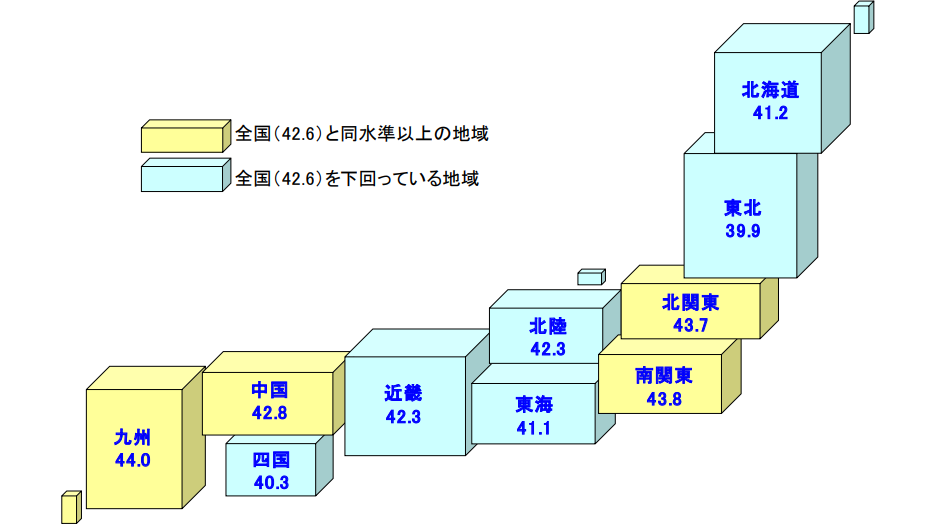 『九州』(44.0)…同1.0ポイント増。2カ月連続で改善。域内8県のうち「沖縄」「熊本」など7県が改善した。「沖縄」は「観光客と企業が戻ってきている」(乗用旅客自動車運送)など観光関連が上向き全国で第1位、「熊本」は半導体生産関連などが好材料だった。