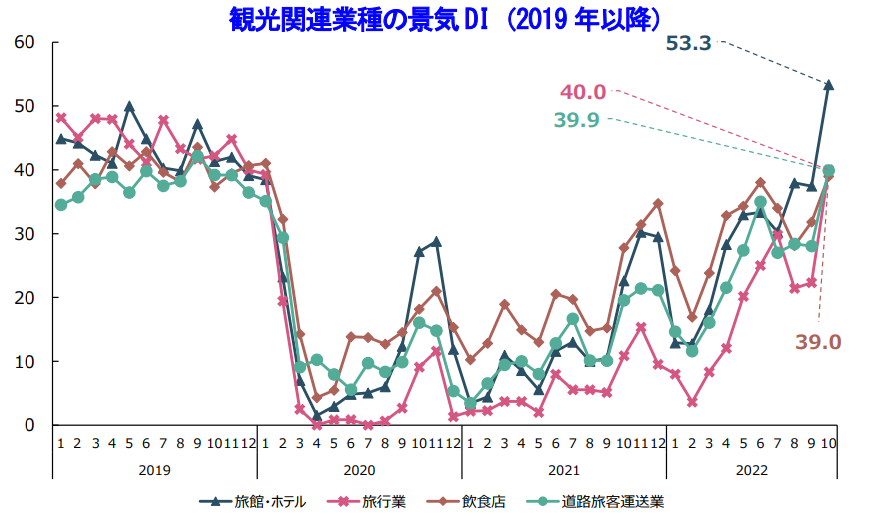 全国旅行支援の開始で観光関連の景況感が回復。特に、「旅館・ホテル」は53.3(前月比15.9ポイント増)、「旅行業」は40.0(同17.7ポイント増)、「飲食店」は39.0(同7.2ポイント増)、観光バスなどの「道路旅客運送業」は39.9(同11.8ポイント増)とそれぞれ大幅に改善。