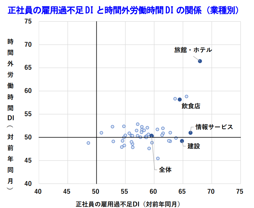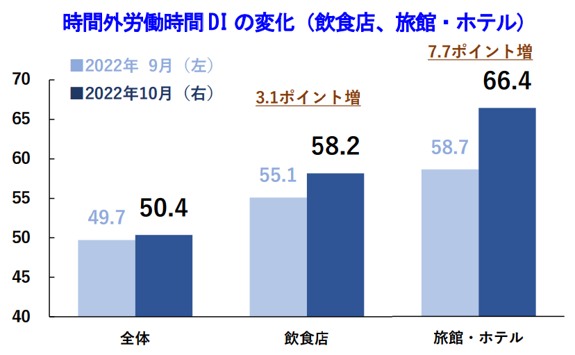特に「旅館・ホテル」(雇用過不足DI:67.9、時間外労働時間DI:66.4)では人手不足に加え、超過労働が急増している