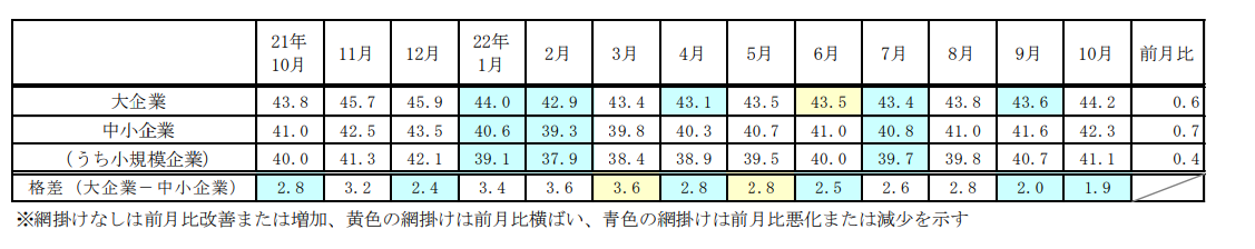 「大企業」(44.2)…前月比0.6ポイント増。2カ月ぶりに改善。人流が戻りつつあるなか、飲食料品小売や飲食店、アパレル関連、娯楽サービスなどが大きく改善。またDX関連などのIT投資需要が旺盛な大手ソフト開発の景況感が高水準で推移した。