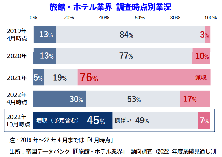 2022年10月時点で、旅館ホテル業界において2022年度の増収を見込む企業は45%まで増加している。