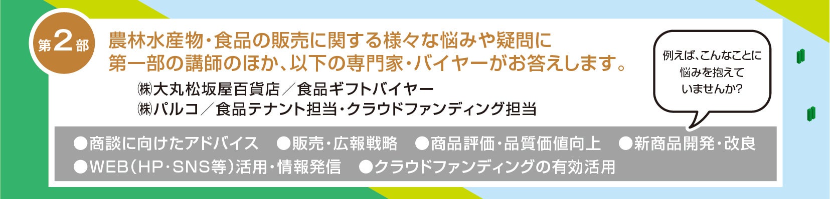 本イベントは、農林漁業者様・食品事業者様の多くが抱える「販売に関する悩み」「PRに関する知識」等に関し、イベントを通じて今後の販売に役立てて頂けたら、という趣旨で実施。パルコ、さらにJ.フロント リテイリンググループ全体のネットワークを活かし、セミナー講師及び専門家の参加調整を行ったほか、当日の情報交換・交流にて、参加者へのアドバイスなどを行いました。