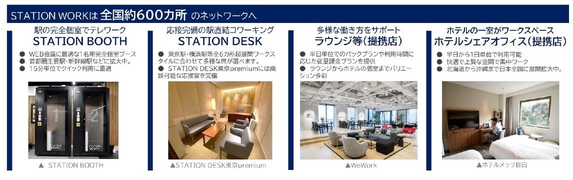 2019年8月に開業したJR東日本のシェアオフィス STATION WORK は、「働く人の“1秒”を大切に」を事業コンセプトに多様な働き方をサポートしており、今回の「STATION DESK東京丸の内」のリニューアルオープン時点で、全国約600カ所のネットワークとなります。駅の便利なワーキングブースSTATION BOOTHはもちろん、WeWorkなどのラウンジやホテルシェアオフィスといった各種アライアンスを強化していきます。2023年度1,000カ所体制に向けて、今後もスピーディーに拠点拡大を進めます。