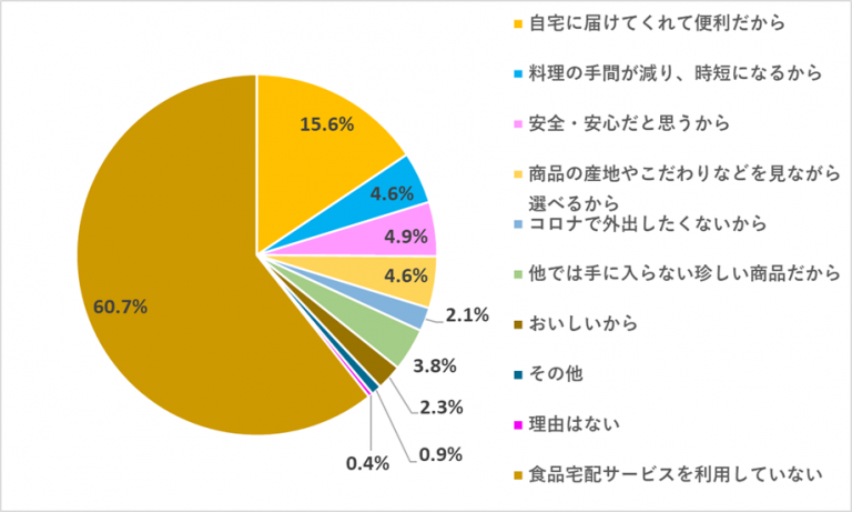 「食品宅配サービスを利用している理由は何ですか?」の質問に対し、最も多かった答えは「自宅に届けてくれて便利だから」が15.6%でした。「安全・安心だと思うから」が4.9%、「料理の手間が減り、時短になるから」「商品の産地やこだわりなどを見ながら選べるから」がそれぞれ4.6%でした。