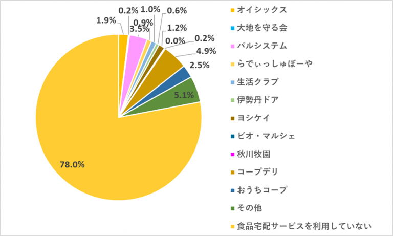 「どこの食品宅配サービスを利用していますか?」の質問に対し、「コープデリ」が4.9%、「パルシステム」が3.5%、「おうちコープ」が2.5%という結果になりました。コープ系のサービスを利用している方が多いのかもしれませんね。