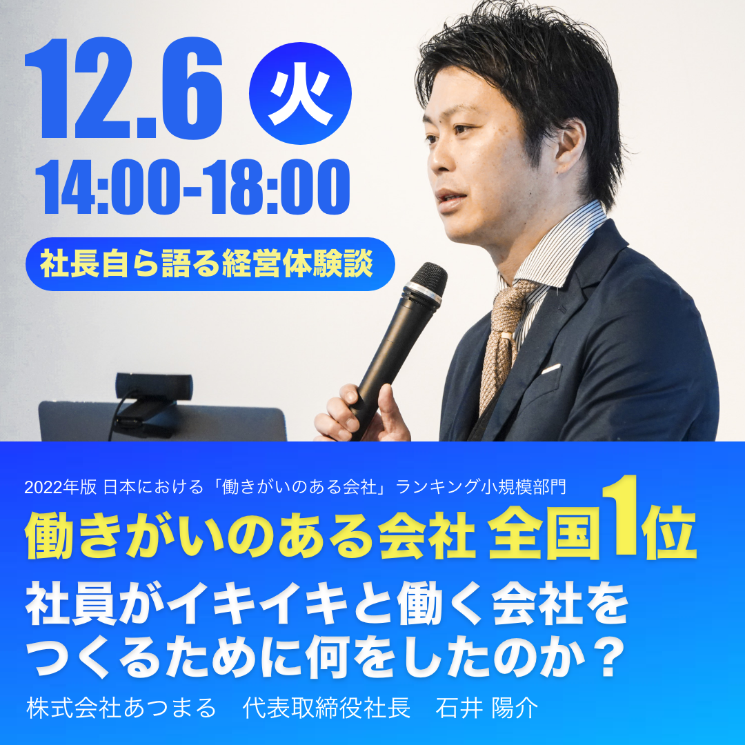 株式会社あつまる(本社:東京都渋谷区、代表取締役社長:石井 陽介)は、下記の通り採用・社員教育にお悩みの経営者の皆様に向けたイベントを開催いたします。