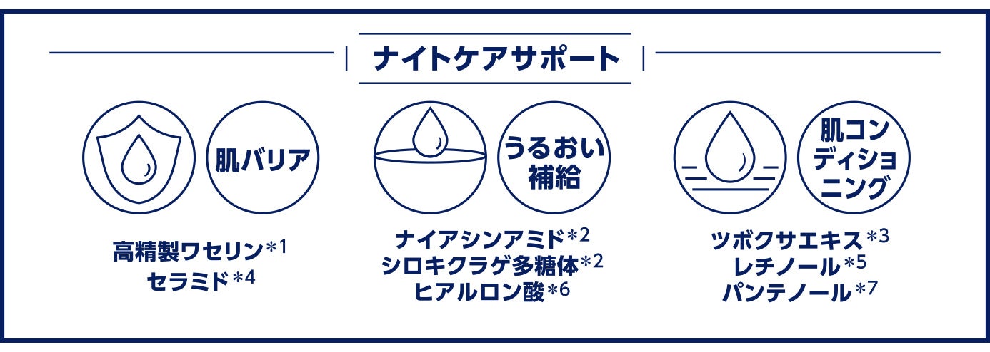 「肌バリア」「うるおい補給」「肌コンディショニング」を整えて、夜の保湿ケアをサポート。