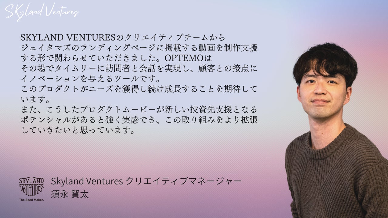 「アポイントを取らずにその場で商談する」インサイドセールス向けSaaS”OPTEMO(オプテモ)”を開発、運営。B Dash Camp、TechCrunch Tokyoといった国内有数のピッチ大会へファイナリストとして選出され、IVS 2022 LaunchPad NAHAでは過去最多の応募の中から5位に入賞。「日本の商習慣を変える」という想いの下、新たなWEB体験を通じて「ヒト、コト、モノがさっとはまる」社会の実現を目指している。