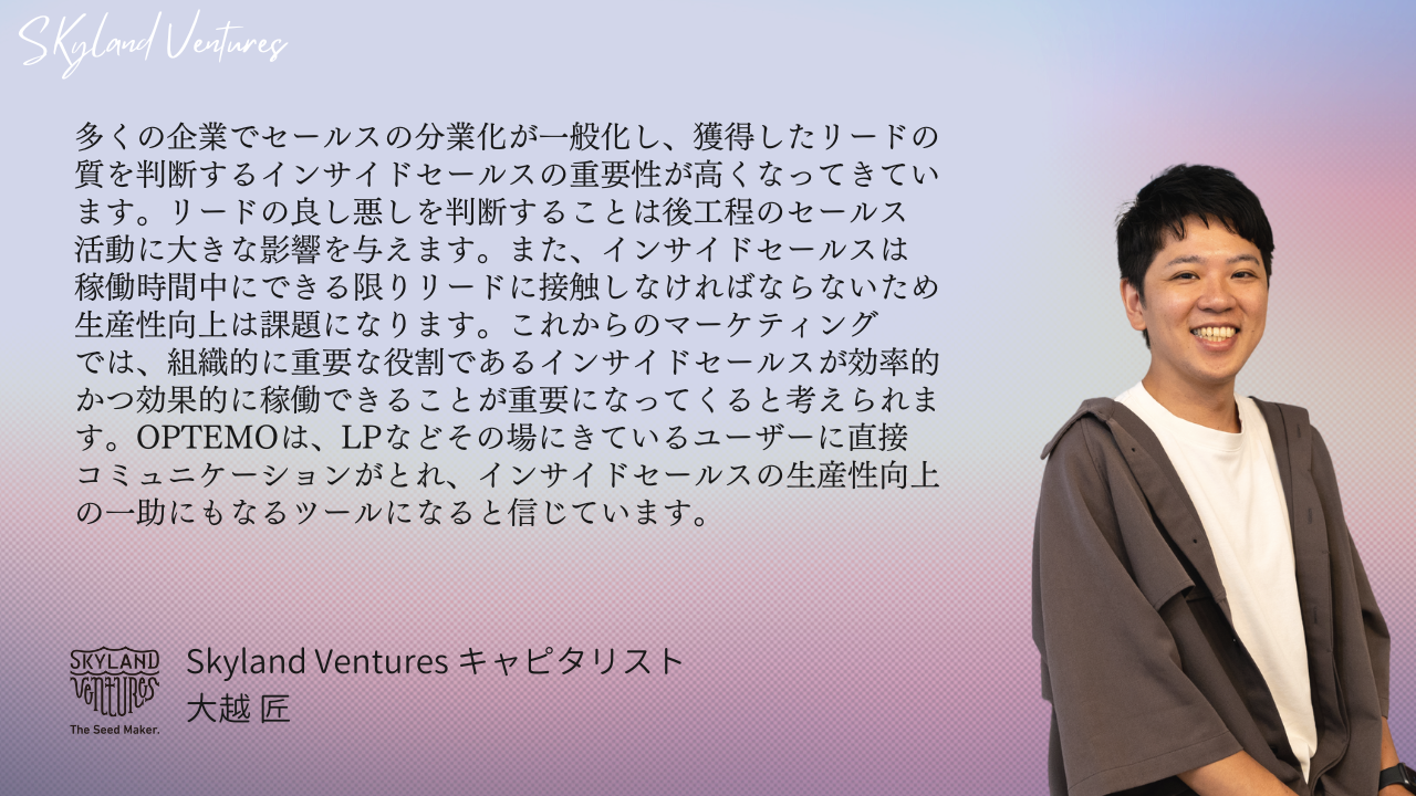 「アポイントを取らずにその場で商談する」インサイドセールス向けSaaS”OPTEMO(オプテモ)”を開発、運営。B Dash Camp、TechCrunch Tokyoといった国内有数のピッチ大会へファイナリストとして選出され、IVS 2022 LaunchPad NAHAでは過去最多の応募の中から5位に入賞。「日本の商習慣を変える」という想いの下、新たなWEB体験を通じて「ヒト、コト、モノがさっとはまる」社会の実現を目指している。