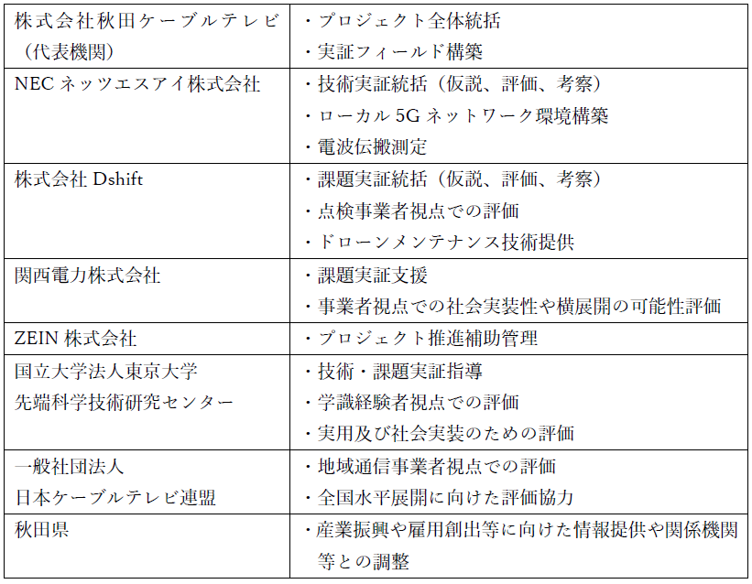 株式会社秋田ケーブルテレビ(秋田県秋田市八橋南1-1-3)、NECネッツエスアイ株式会社(東京都文京区後楽2-6-1 飯田橋ファーストタワー)、株式会社Dshift(大阪府大阪市西区京町堀1-7-9 東洋ビル8F)、関西電力株式会社(大阪府大阪市北区中之島3-6-16)、ZEIN株式会社(東京都港区芝5-3-2 +SHIFT MITA 2F)、国立大学法人東京大学(東京都文京区本郷7-3-1)、一般社団法人日本ケーブルテレビ連盟(東京都中央区京橋1-12-5 京橋YSビル4F)、秋田県(秋田県秋田市山王4-1-1)は、株式会社秋田ケーブルテレビを代表機関とするコンソーシアムを形成し、令和4年度・総務省「課題解決型ローカル5G等の実現に向けた開発実証」において、『ローカル5Gを活用した風力発電の設備利用率向上によるカーボンニュートラル社会の実現』を提案し、採択されました。