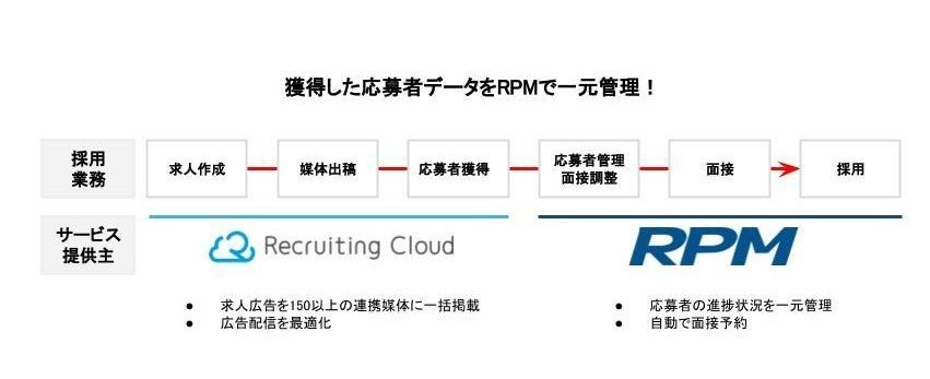 今回の協業より、Recruiting Cloud経由の求人広告で獲得した応募者情報を「RPM」へ自動で格納できるようになり、求職者の集客から採用までの一貫したサポートを実現しております。