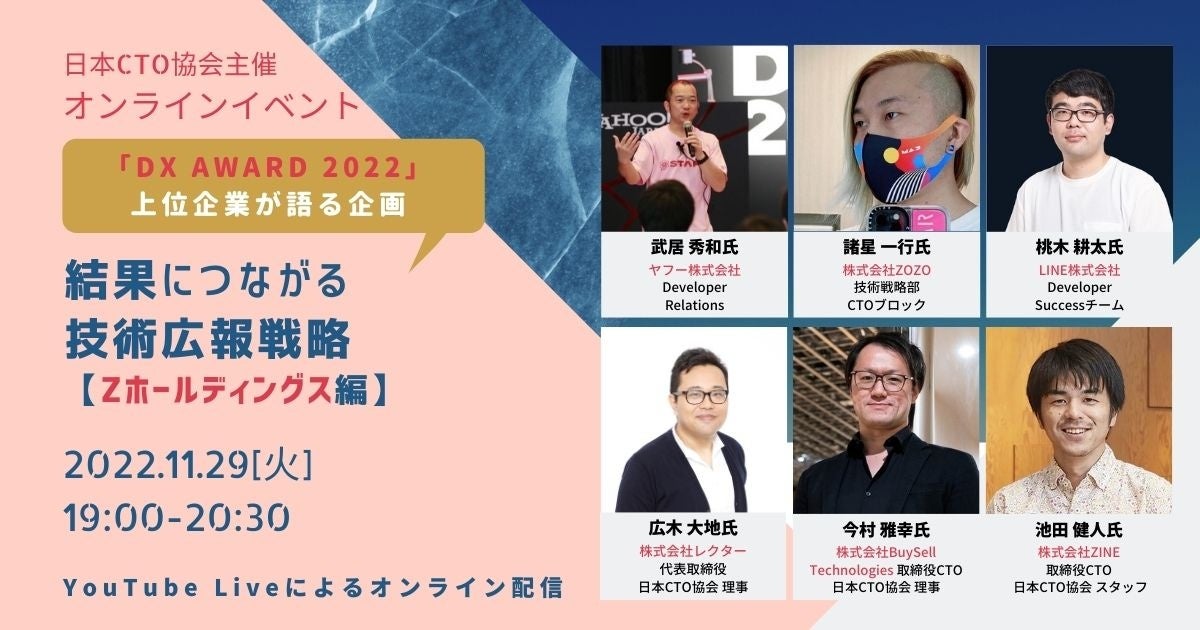 一般社団法人日本CTO協会(本社:東京都渋谷区/代表理事:松岡剛志、以下:日本CTO協会)は、2022年11月29日(火)に「Developer eXperience AWARD 2022」(以下、DX AWARD 2022)の上位企業の技術広報担当者が登壇する無料オンラインイベント、「『DX AWARD 2022』上位企業が語る、結果につながる技術広報戦略【Zホールディングス編】」を開催いたします。