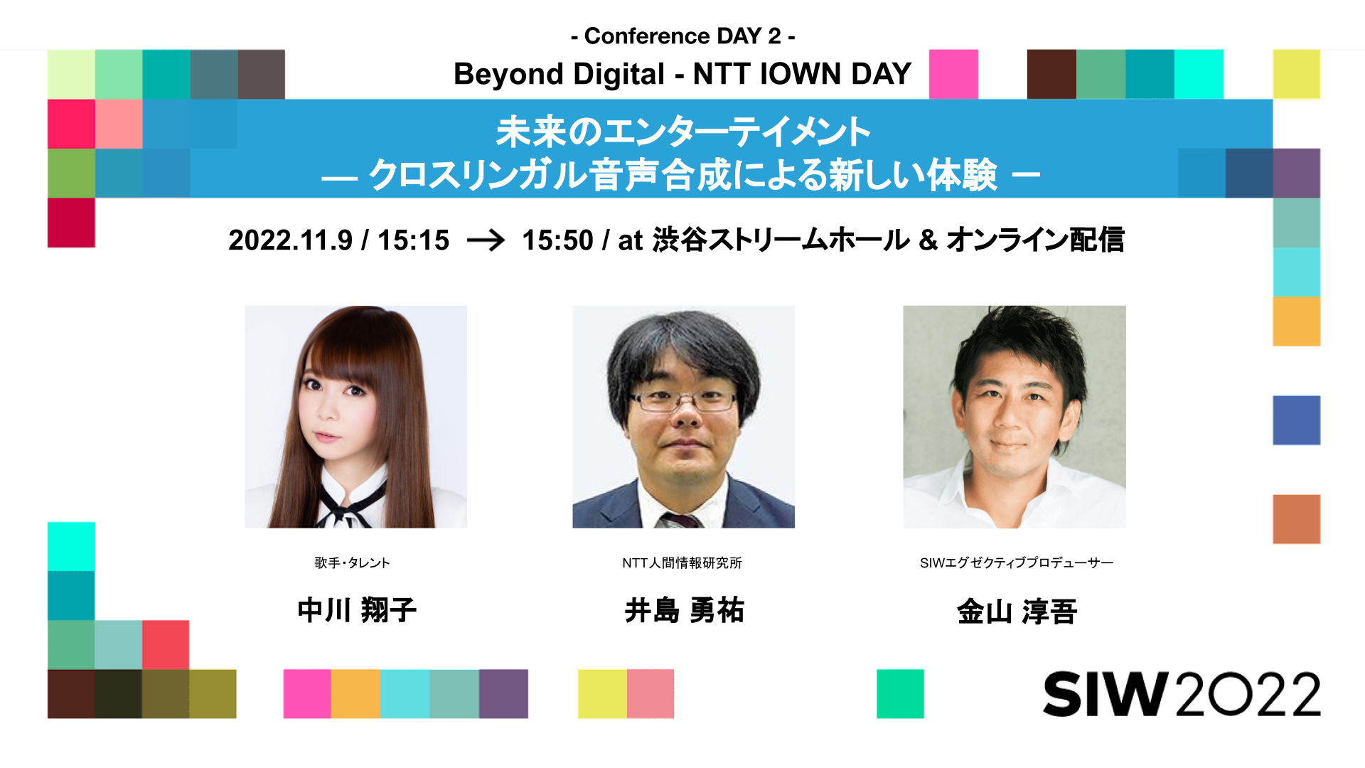 NTTが研究開発したクロスリンガル音声合成技術は、大好きな演者の声のまま、自分が聞きたい国の言葉で聴ける、新しい体験価値です。中川翔子さんに技術を体験頂き、あらゆるコンテンツがオリジナルの臨場感のまま体験できる未来について語り合います。