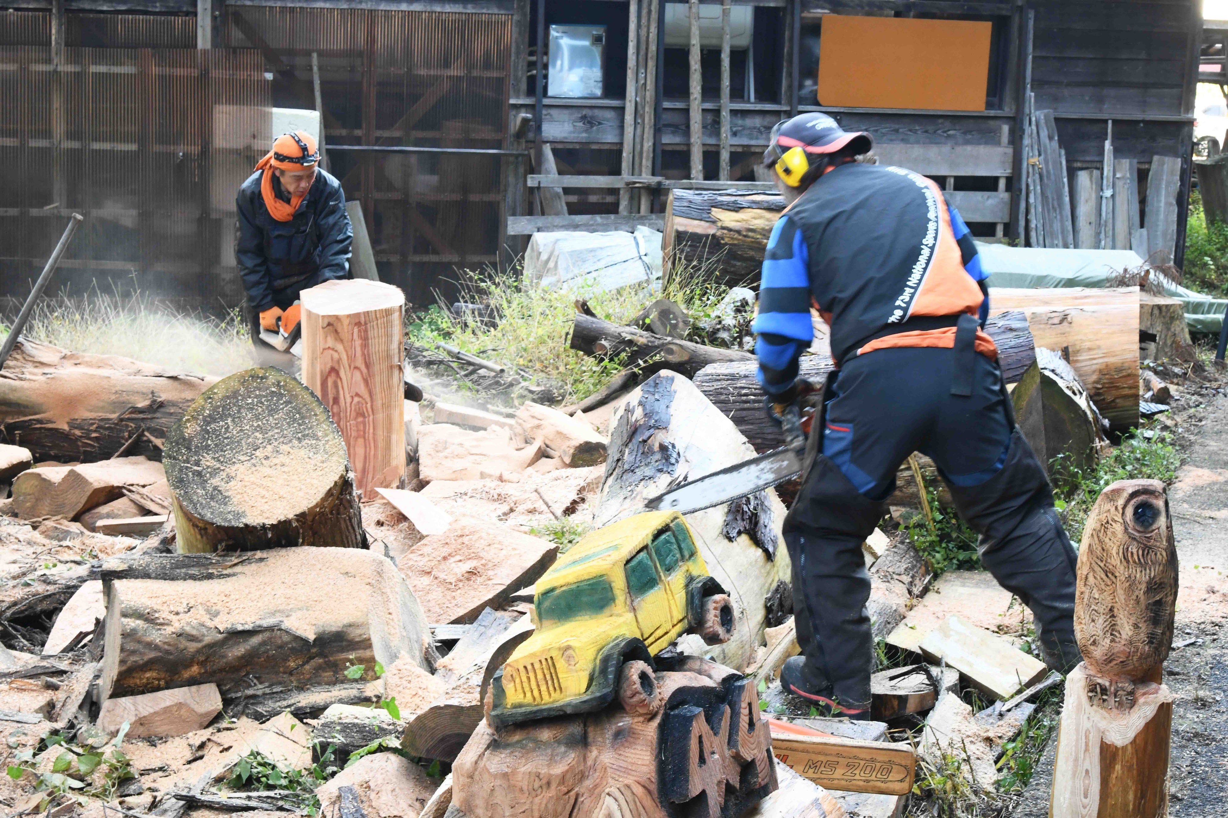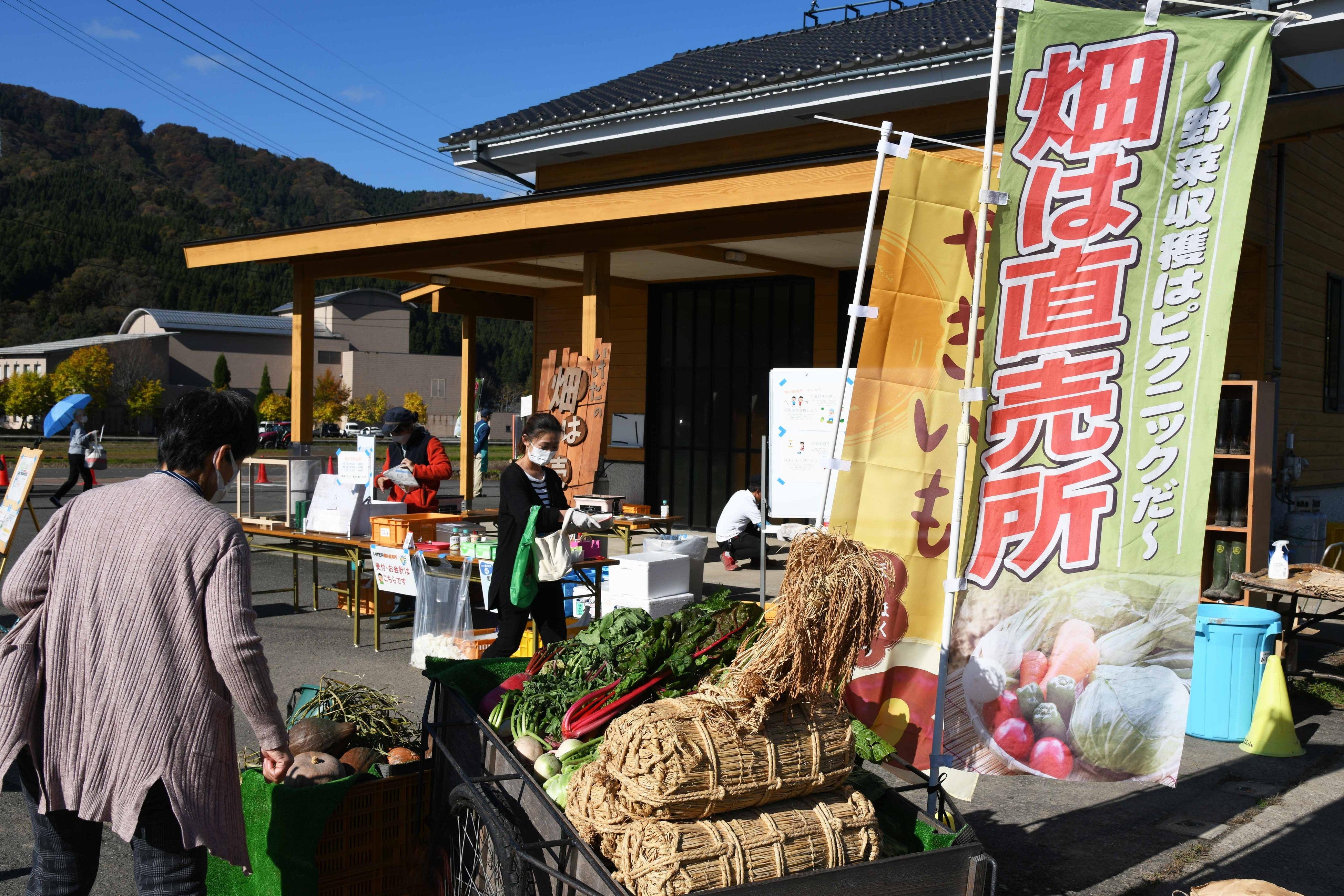 9の出店者が様々な販売企画を展開しました。杉丸太のチェーンソーアートの実演販売や、池田小学校の3・4年生と老人クラブの方が一緒に育てた野菜の販売など、出店者との会話を楽しみながらのお買い物で町が賑わいました。