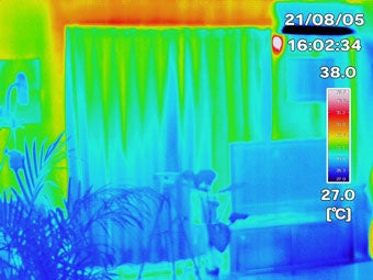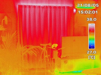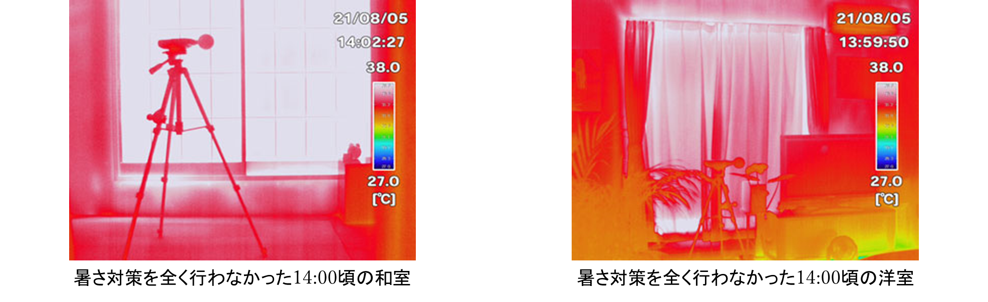 室内全体が暑くなり、洋室ではカーテン上部の隙間から熱が入り込む様子もうかがえた。室温は日当たりなどでも変化するため、過ごす部屋の窓の方角にも注意が必要。また、日が当たる窓際が熱くなることもある。