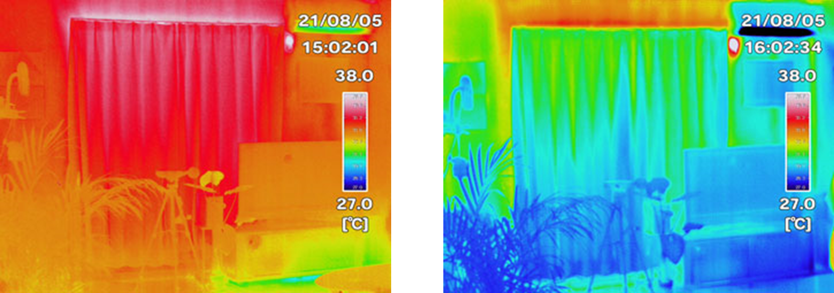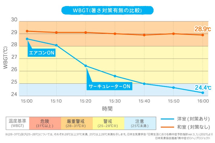 - 猛暑日において、暑さ対策をしない室内の温度は日中34.5℃を観測、WBGTは「厳重警戒」ランクと、熱中症を引き起こす危険性が高い環境に。