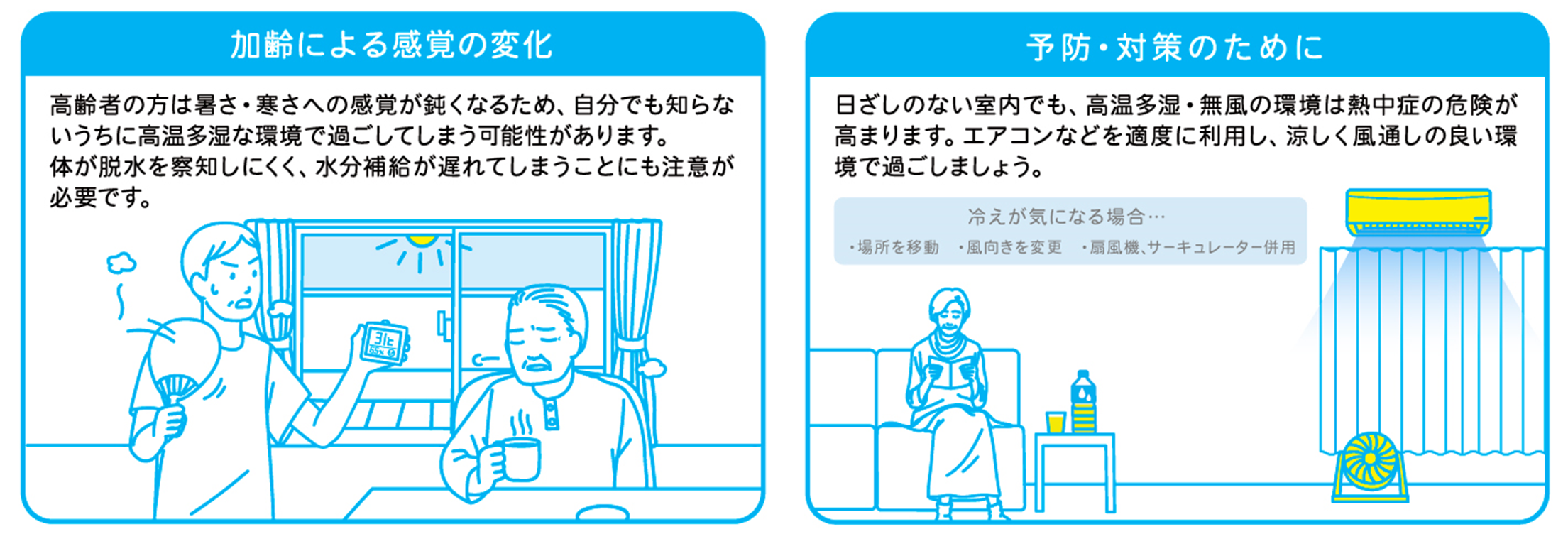 冷房機器を使用して、室温を適度に下げることが大切。冷えなどが気になる場合は、エアコンの設定を変更する、過ごす場所を変える、部屋の温度が均一になるように工夫して、熱中症になりにくい環境を維持する必要がある。