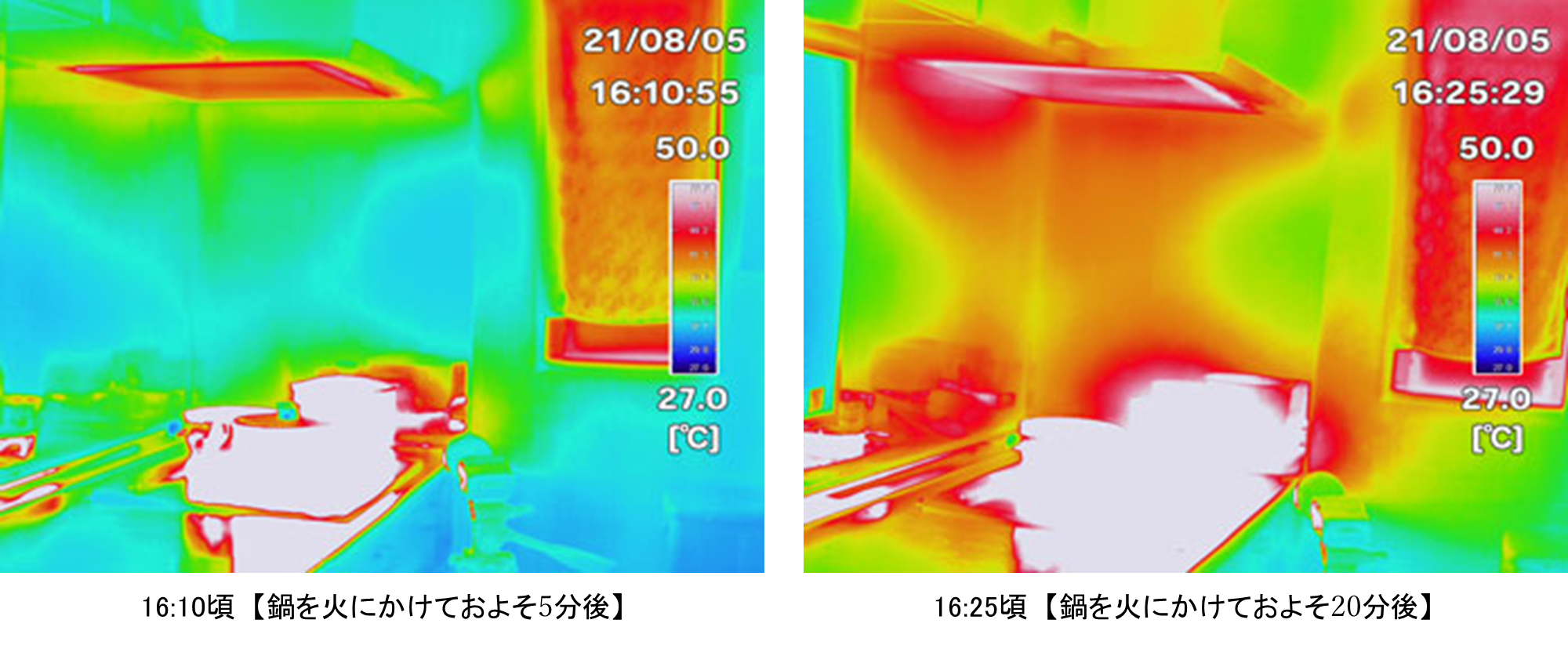 高温多湿になりやすいキッチンも熱中症に特に注意が必要な場所の一つ。西日の入りこむ夕方16:00頃、3口コンロ全てで鍋の水を沸騰させた際の温度変化の様子を撮影した。