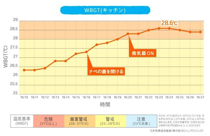 ・鍋に火をかけた後から、キッチン内でのWBGTは上昇。観測時間内での最高は、16:23、16:24時点の28.6℃で「厳重警戒」ランク。