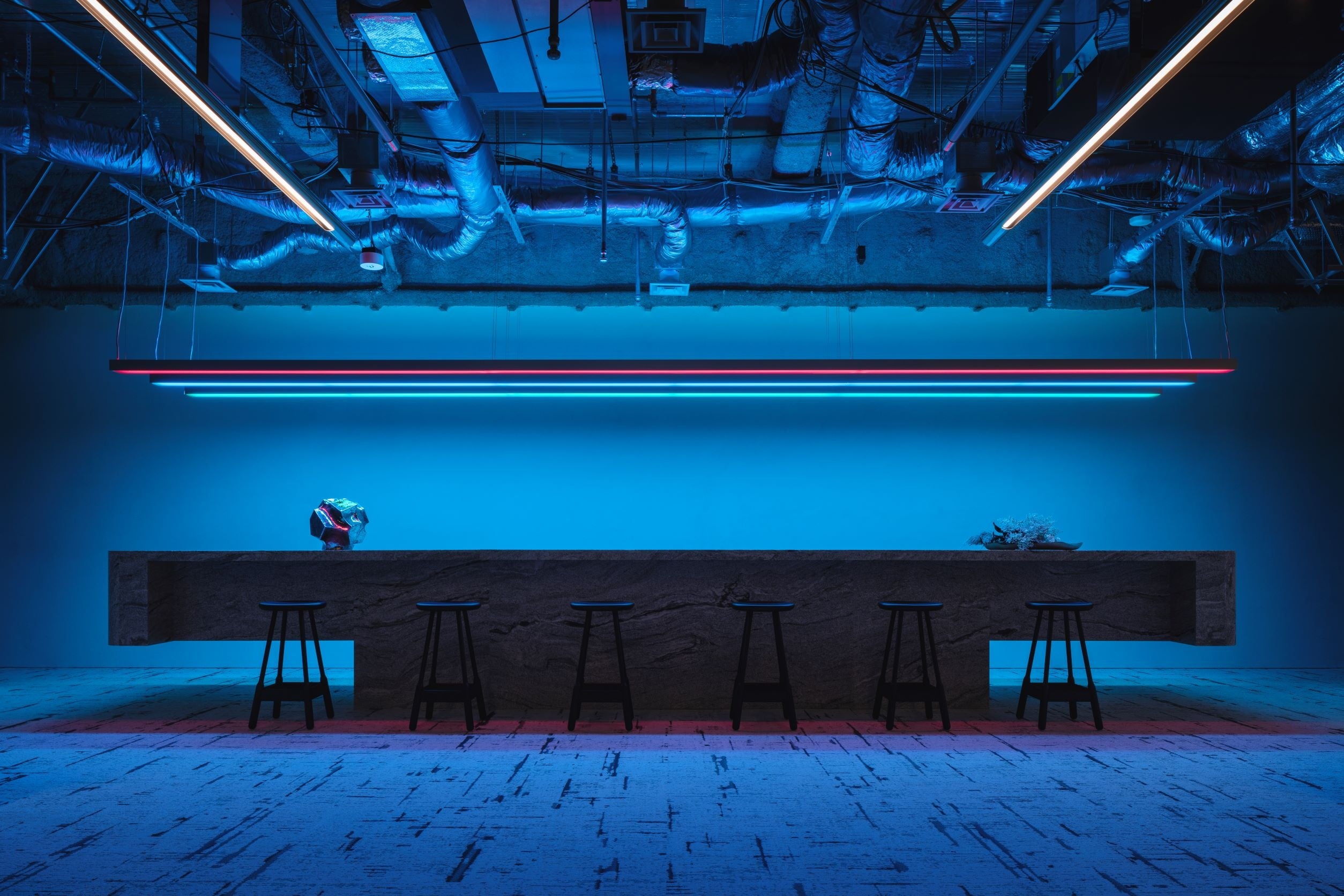 オフィスの入口に位置するカウンター席には、コーポレートカラーのネオンサインを起用。異空間演出を施し集中して作業できる空間も確保しました。