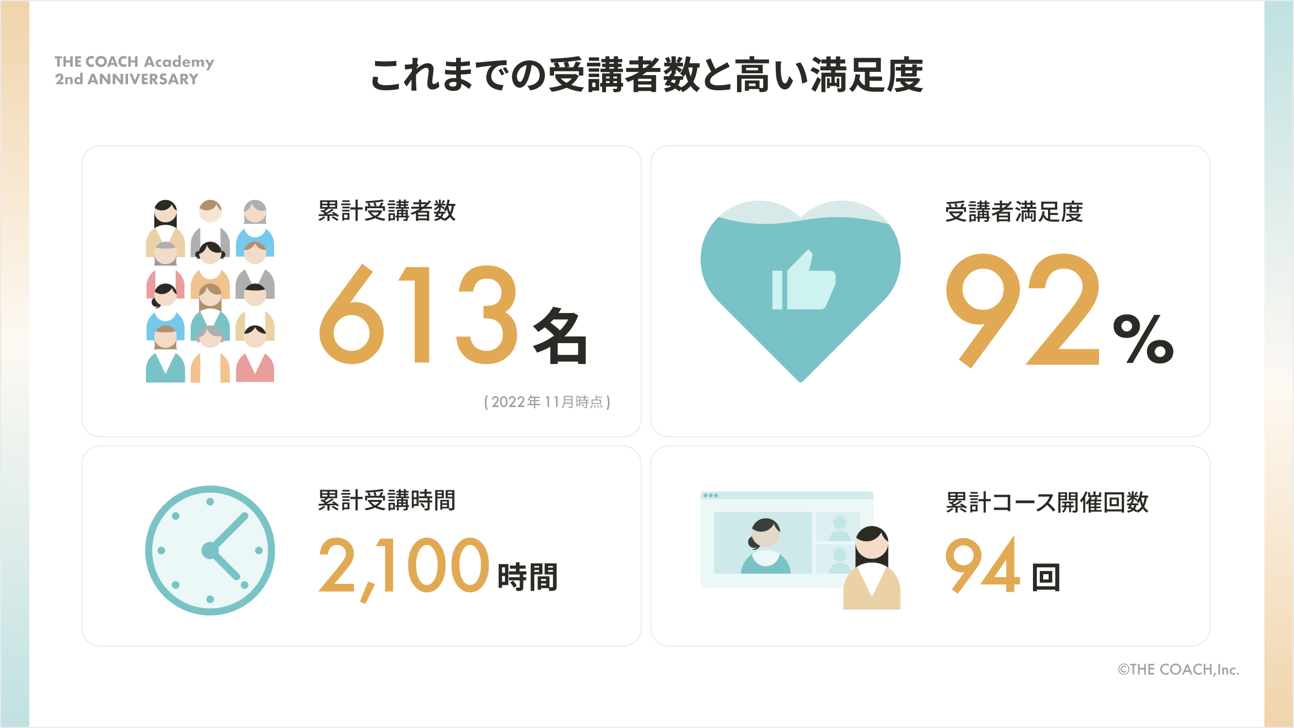 サービスリリースから2年間で累計受講者数は613人を突破。受講者満足度は92%と多くの方がTHE COACH Academyで充実した学びを得ています。