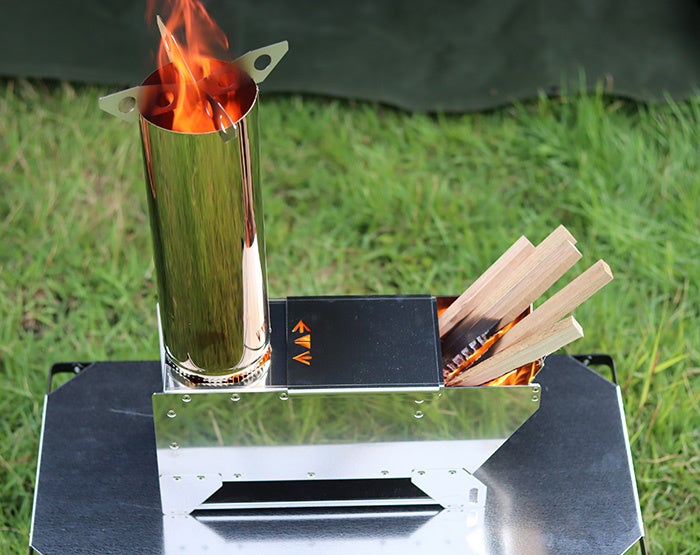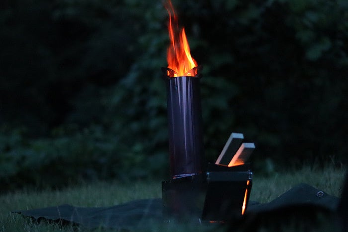 ドラフト効果(煙突効果)を利用して、少量の燃料で強い火力を生み出すことができる高い燃焼効率が特徴です。薪じゃなくても、木の枝や松ぼっくりなどの身近な材料を使って高火力が得られることから、キャンプでの使用はもちろん、非常時の備えとしても役立ちます。