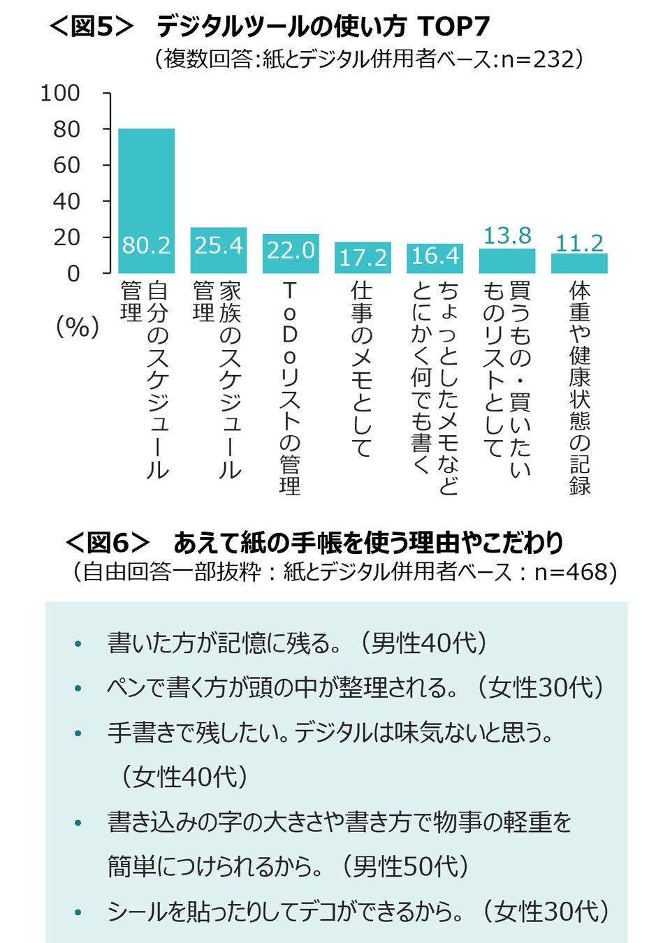 「書いた方が記憶に残る」「書いた方が頭が整理される」「デジタルは味気ない」などが、あえて紙の手帳を使うこだわり。 <図6>