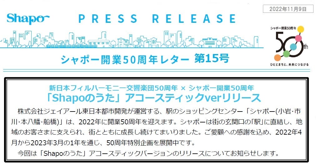 シャポー開業50周年を記念した「Shapoのうた」に、新たに、同じく創立50周年を迎えられた「新日本フィルハーモニー交響楽団」の演奏による「Shapoのうた」アコースティックバージョンが出来上がりました。