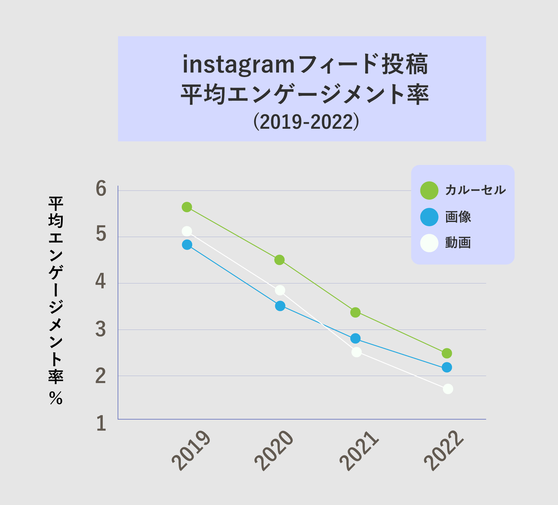ところが、新規メディアであるTikTokはもちろん、既存メディアであるInstagramのStories面/Reel面・LINEのVoom面・YouTube Shortなど、縦型動画の役割は益々大きくなってきているのは事実です。Instagramでは、縦型動画の投稿面であるリール面の登場による影響でフィード面のエンゲージメント率は2019年以降下がり続けており(※)、正方形の静止画より縦型動画の方が成果を出しやすいメディアとなりつつあると言えます。