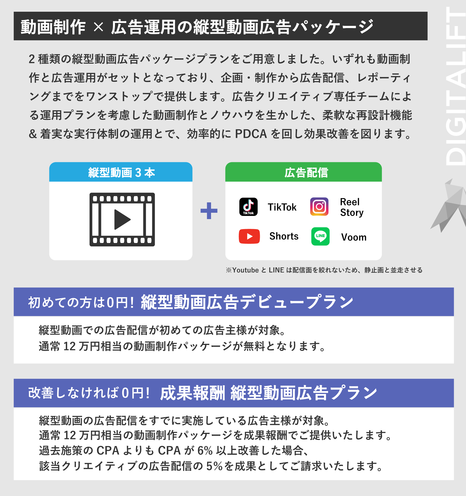 需要の伸び続ける縦型動画広告の成果を、もっと多くの広告主に試してもらえるよう、デジタリフトではこの度、縦型動画を配信したことがない広告主様や、配信したが成果がでていない広告主様のための特別プランをお試ししやすい価格でリリースいたしました。