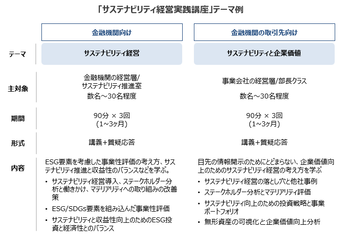 特に金融機関においては、自らのサステナビリティ向上に加えて、取引先の事業会社に対しサステナビリティ経営を踏まえたコンサルティングを提供することが求められています。それには、サステナビリティ経営に対する深い理解とともに、未来を予測するためのデータ分析や関連技術に関する知見も求められます。