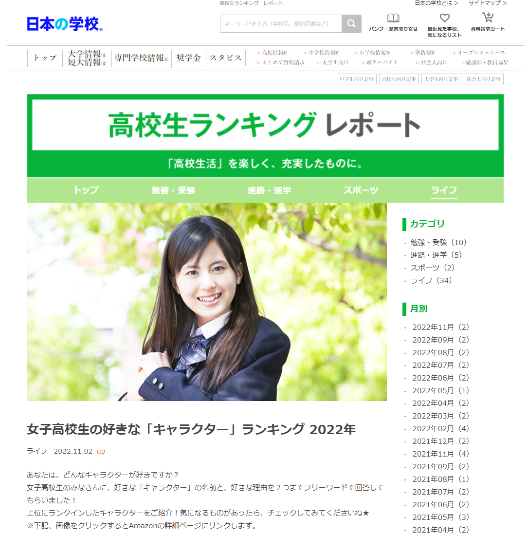 高校生ランキングレポート「女子高校生の好きな「キャラクター」ランキング2022年」:https://school.js88.com/koukousei/life/53