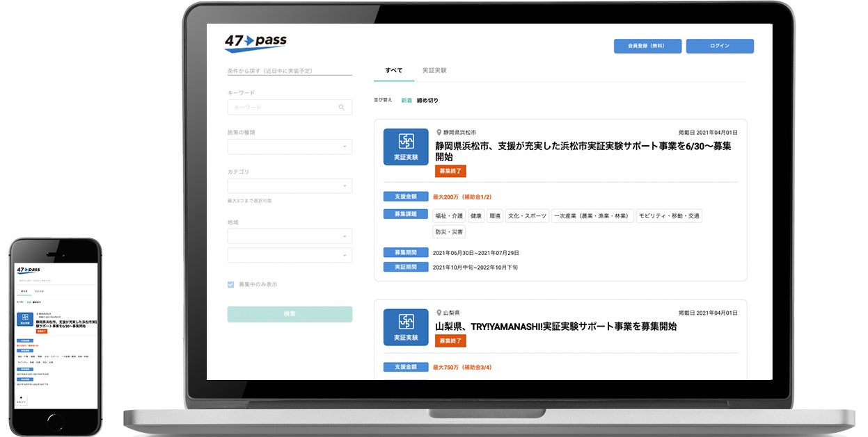 そこで弊社は、自治体の施策に着目し、地方への事業拡大を図る企業を対象とした、自治体施策の情報収集から申請までをDXする情報プラットフォーム「47pass(よんななパス)」(https://lp.47pass.jp/)を開発しました。サービスを通し、企業のコストを抑え、対象地域へ効率的に事業拡大することで地域課題解決に取り組む企業の支援に取り組んでいます。