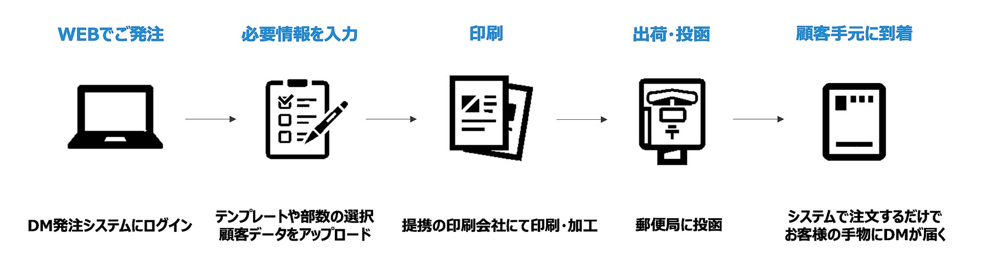 本サービスはこのような潮流・ニーズに対応するだけでなく、DM配送の手間も最小限にしたサービスです。WEB上でCSVデータを登録いただけば、事前につくったテンプレートを使って簡単に各お客様に合ったDMの発注ができ、ワンストップで印刷、加工、発送まで全て対応します。