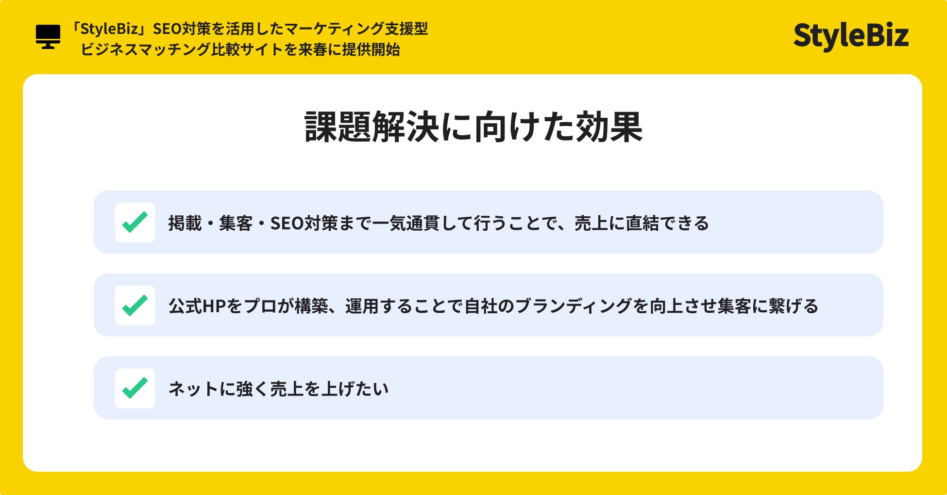 また、「StyleBiz」に掲載することにより、ドメインパワーが大きい被リンクを獲得することが可能なり、簡単且つ安価にマーケティング活動を実行したい事業者に対してのマーケティングをワンストップで提供します。