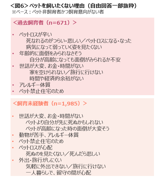 今後、ペットを飼いたくない理由を自由回答で聴取した。過去飼育者では、「ペットロスが辛い」や「年齢的に面倒をみられない」など情緒的な意見が多かった。飼育未経験者では、「世話が大変」「お金・時間がない」「動物が苦手」「アレルギー体質」など、ペット飼育に対する現実的な声が多く聞かれた。<図6>