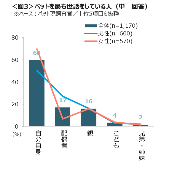 ペットを現在飼っている世帯において、最もペットの世話をみている飼育者は、「自分自身」が60%と最も多く、次いで「配偶者」の17%と「親」の16%。男性より女性の方が主に世話をしている。<図3>